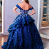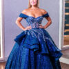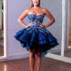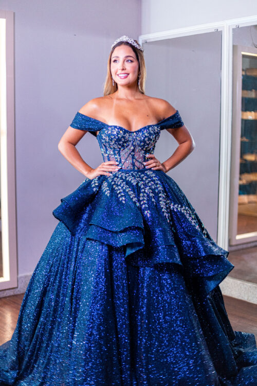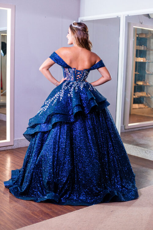 Vestido de debutante azul Marinho 3 em 1 com corpete bordado e três versões de saia: uma curta, outra midi e a 3ª com saia volumosa, moderna e elegante. Você com um look versátil e encantador!