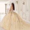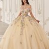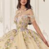 Bordados: Aplicações florais em renda com detalhes tridimensionais, distribuídas por todo o corpete e saia